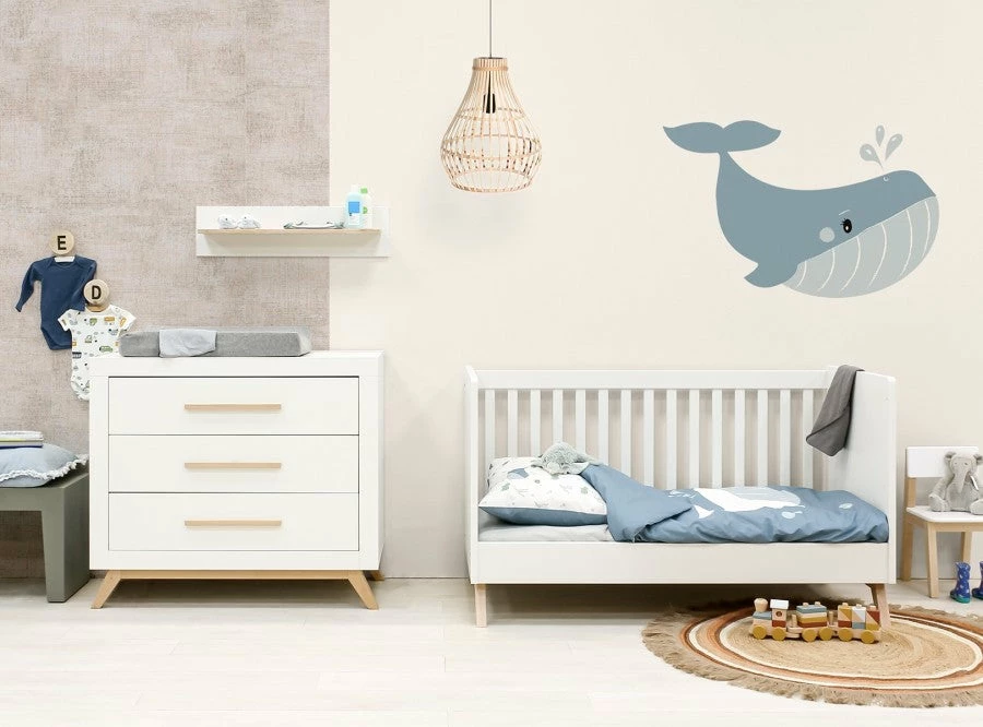 This bed from the series Fenna can be converted from a bed with bars tot a bench bed. The bed is finished in a combination of white and natural lacquered beech wood. Bed bottom, side rack and lower side for the bench bed are included. Bed bottom of the bed with bars is adjustable in height. The size, is the same for both beds so that one mattress is sufficient. Note: this bed can not be converted to a cotbed variant, there is always one bar side.