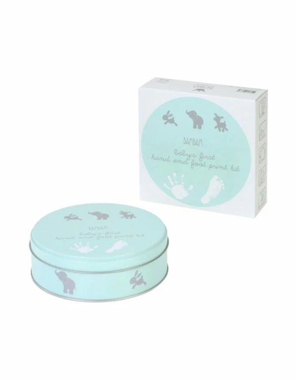 This creative baby hand and footprint kit comes in a stylish white cylinder tin. This is a perfect keepsake tin for keeping the hand or foot print safe forever. You can even write the name and date on the inside of the tin.
