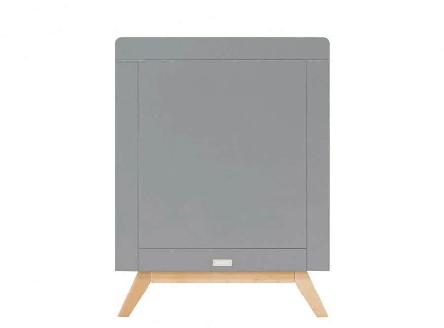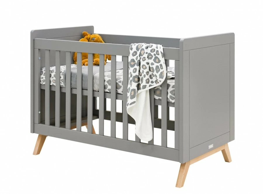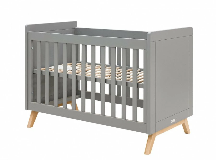 Modern contemporary bed Fenna due to the combination of gray with clear lacquered wooden base. The bed base is adjustable in height, as soon as the baby can pull itself up you can lower the floor for extra safety. Combine this bed with the other furniture in the Fenna series.