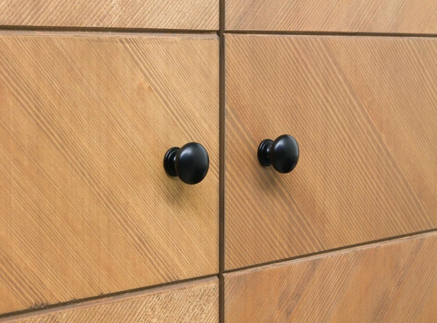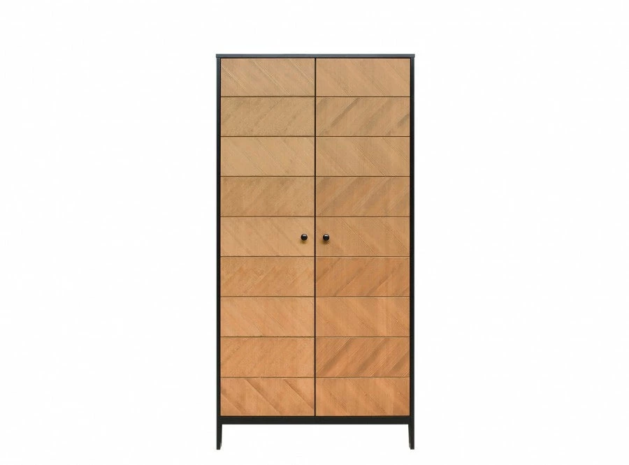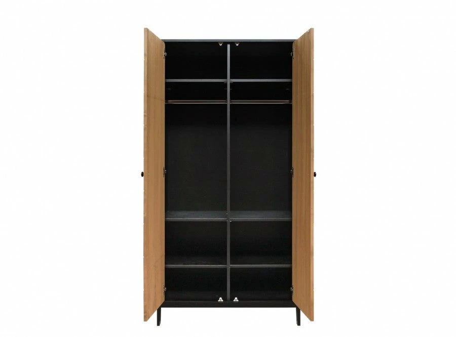 In a cool combination of matt black and veneered wood. Behind each door there are three shelves and a hanging rail. Since it is a natural product, the wood structure can differ per piece of furniture in the Job series.