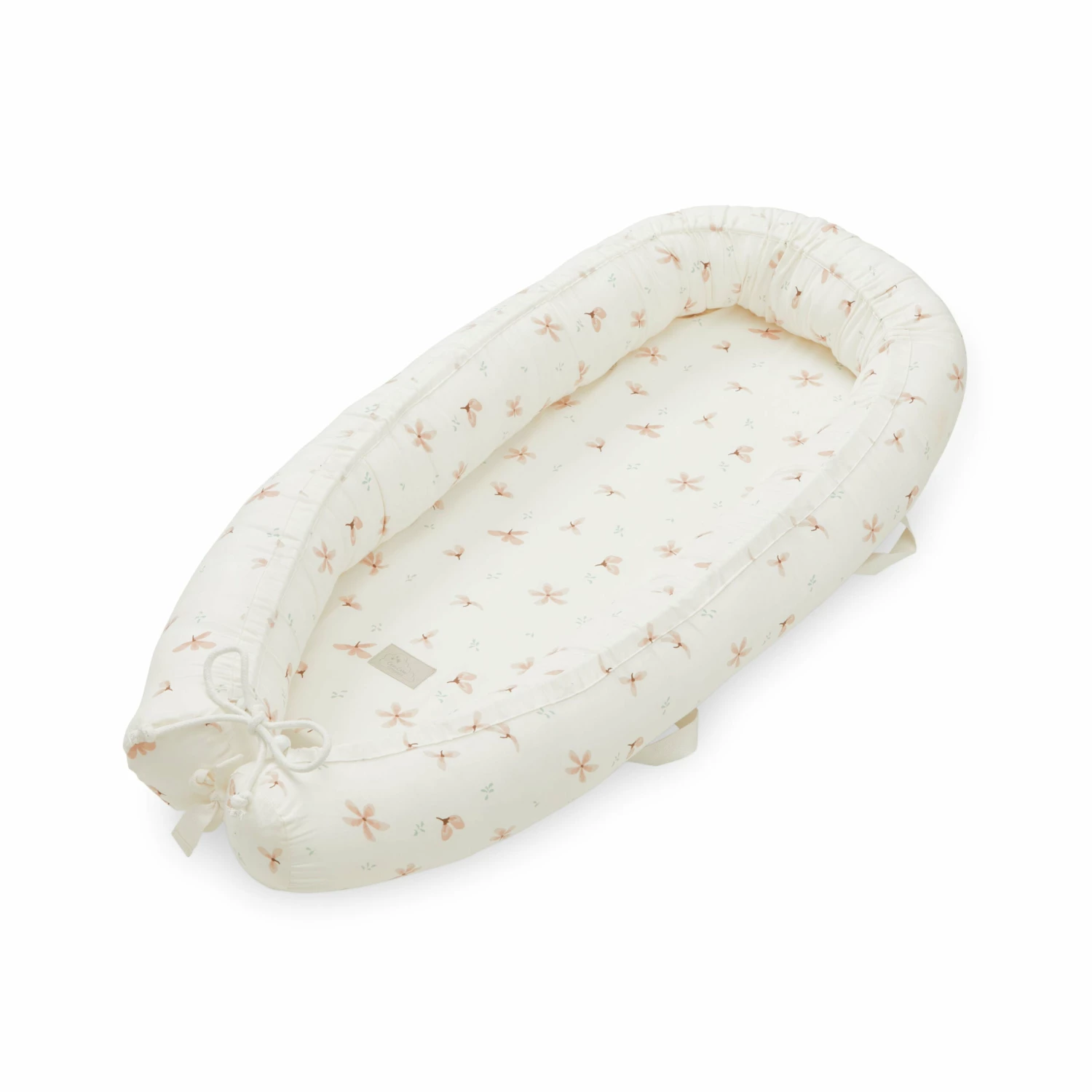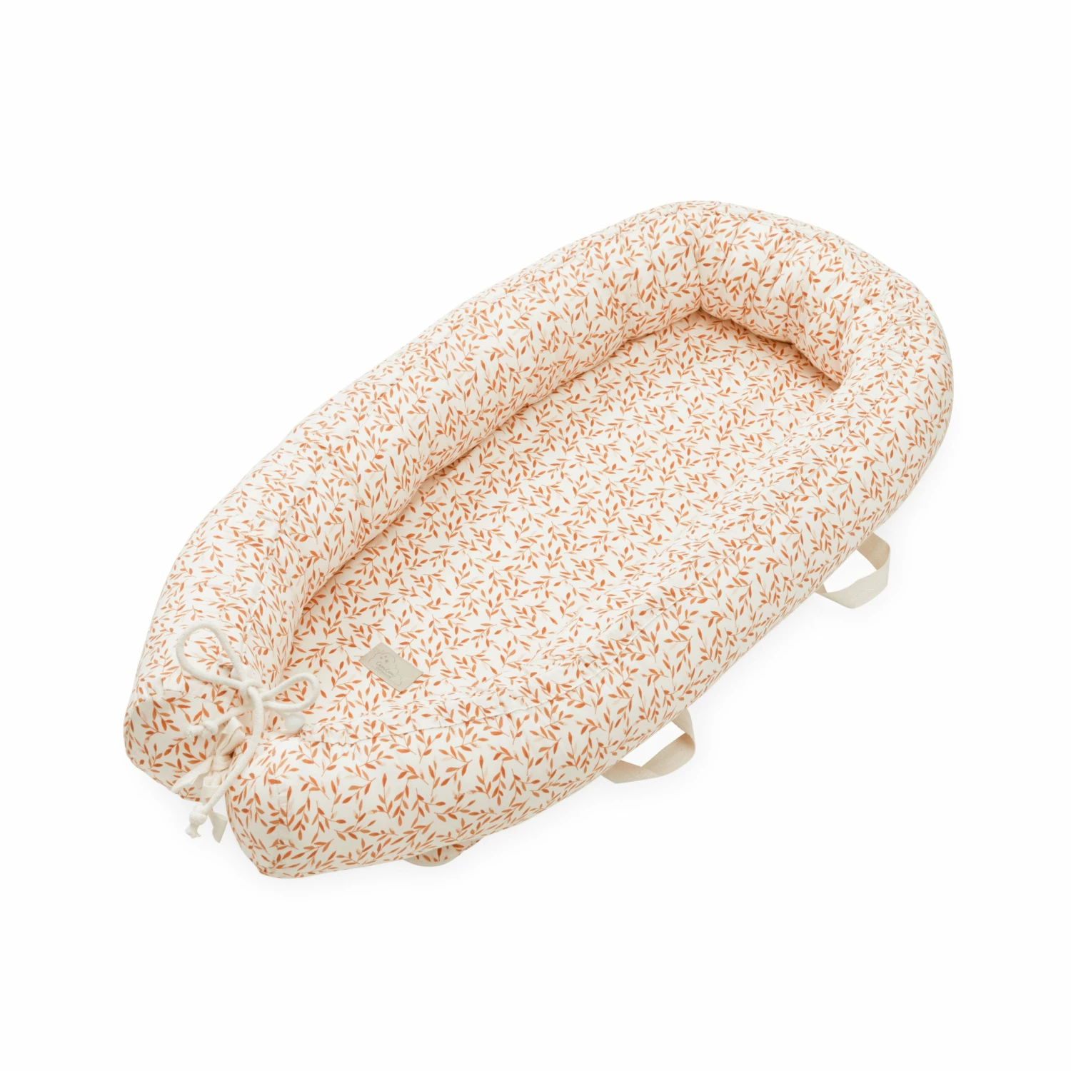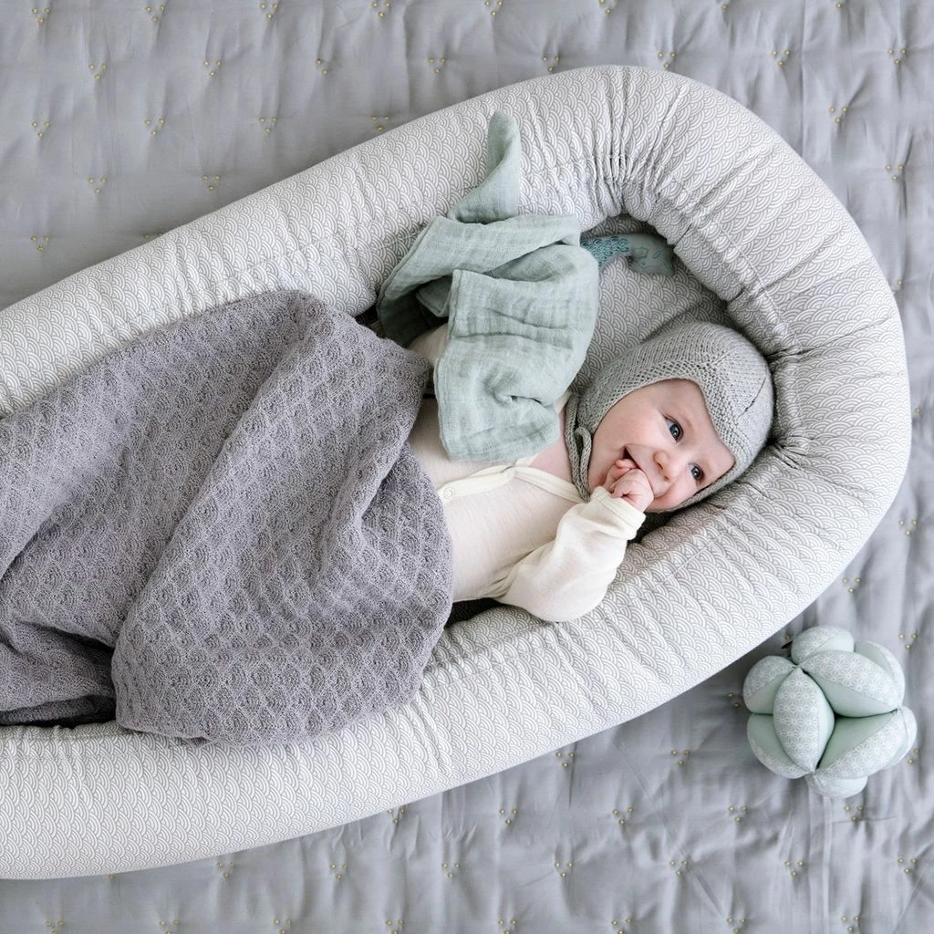 The baby nest can be used on the sofa, in the crib, on your doublebed or when travelling – the four practical carry straps and the wooden piece at the bottom provide security and firmness, so it is easy to move your sleeping baby.