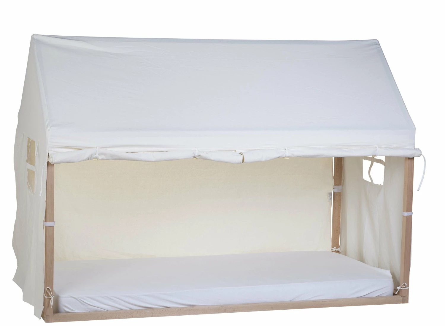 Bedtime has never been this much fun! Transform the house bed frame into a real bed tent for your child. From now on your child will experience the most adventurous dreams in the cosiest bed! You can easily roll up and secure the different sides with the ribbons. This cover in white is custom made for our house bed 90×200 cm.l