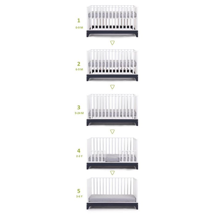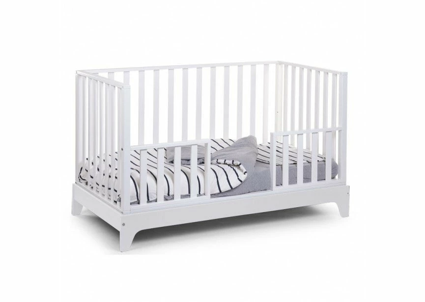 In the beginning, your baby sleeps in the closed bed with 4 slatted sides. As your child gets older, the bed can transition to the next step by removing a slatted side and replacing it with the half open side that is included. This half open side functions as a bed rail and prevents your toddler from falling out of his bed during the night. Once the toddler is used to sleeping in an open bed, the half open side can be removed. In the final stage, all slatted sides can be removed. Once your child has outgrown the bed, the bed can easily become a first sofa. Just ad a few comfy pillows and you can enjoy the sofa for years to come.