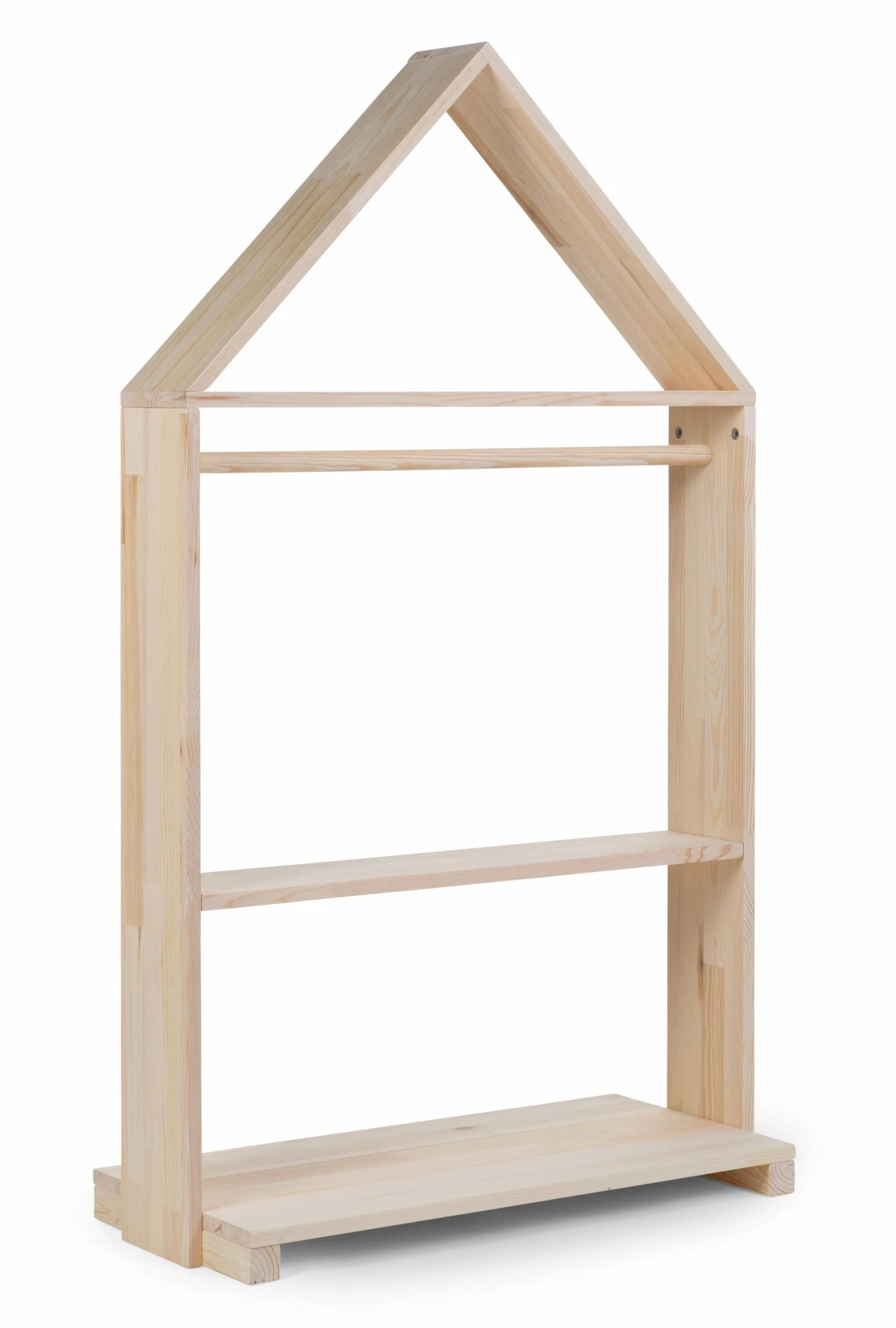 This nice decorative storage rack in the shape of a house stands beautiful in any nursery! The house storage rack is perfect for keeping the nursery tidy. The storage rack is made of durable wood and fits with its natural colour in any interior. The storage house has 3 shelves and is therefore perfect for putting up some nice canvas baskets or other decorative objects. At the top is also a hanging rack so you can easily hang some of your kids clothes. This way you can keep the nursery neat in the most stylish way. Comes with 4 removable wheels, of which 2 with brakes, so you can easily move the storage rack.
