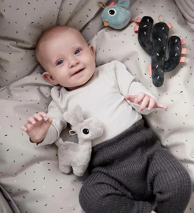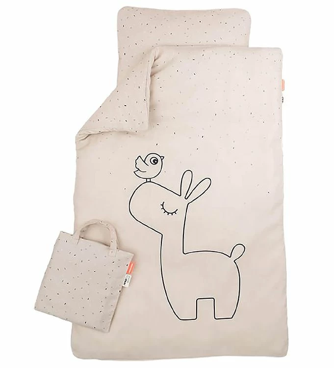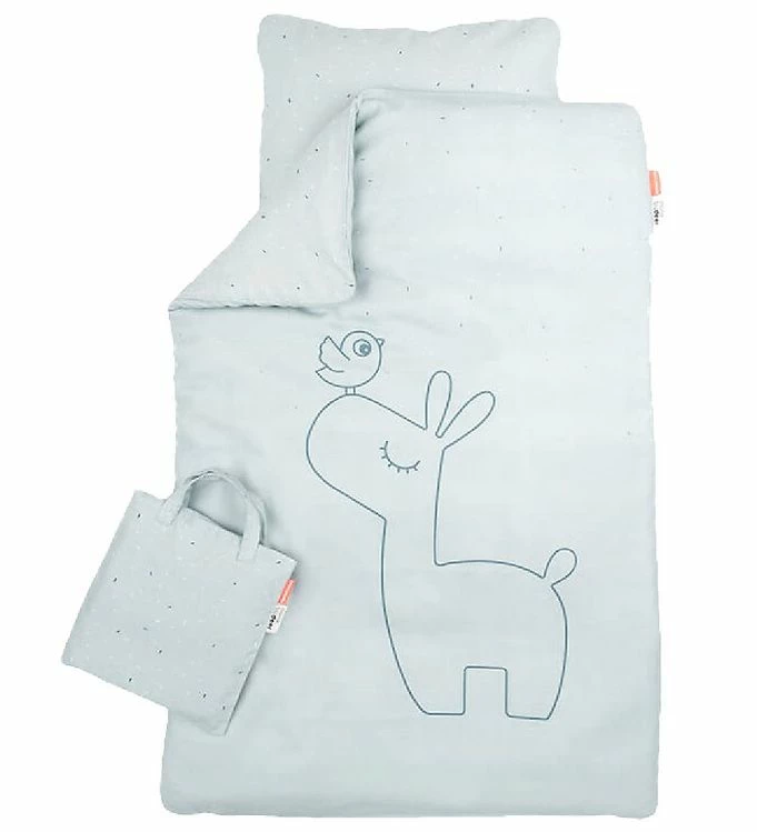 The Lalee junior bed linen in organic GOTS certified cotton feels soft and comfy. Create a cozy sleeping environment with the sleepy Lalee and tug in your child covered in festive confetti print. The junior bedding matches the quilted Waves bed bumpers. The llama junior bed linen is packed in a small tote bag that fits the bedlinen and can be used for toys, a change of clothes, shoes, or other practical purposes. The bedding has a practical YKK safety zipper in both the pillowcase and the duvet cover. The junior bedlinen has an overall blue tone with Lalee, Birdee, and confetti on the front. The backside is sprinkled with a cute confetti print matching the tote bag.
