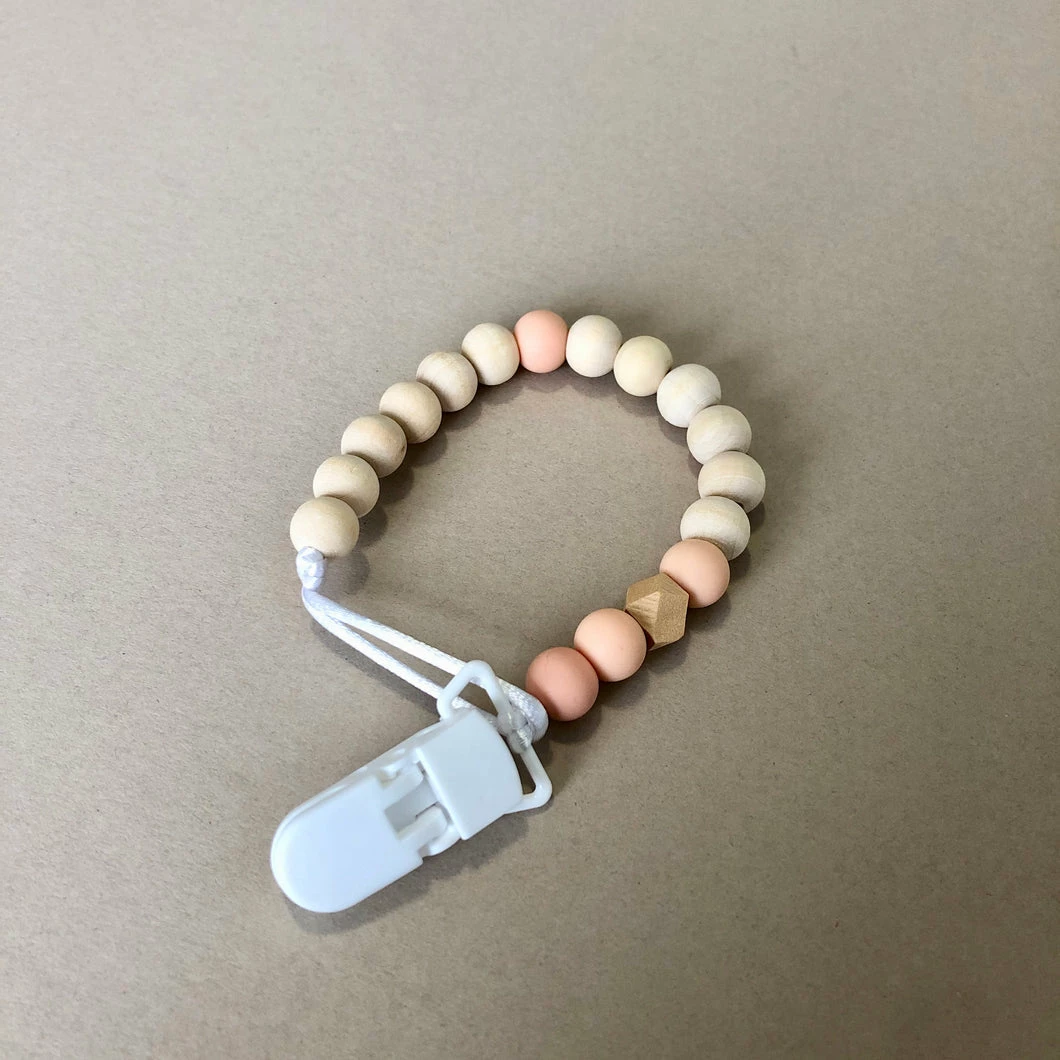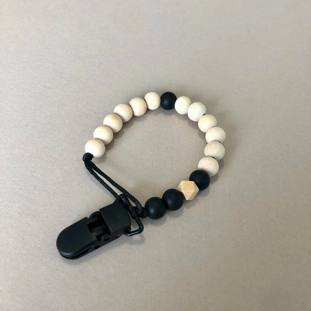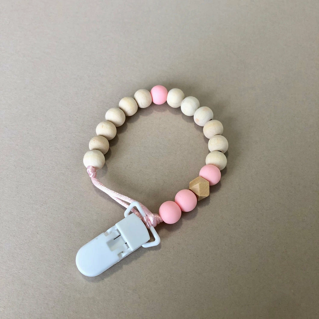 Mix of 12mm Silicone and Wood beads strung on 2mm nylon cord and finished with a dummy clip.