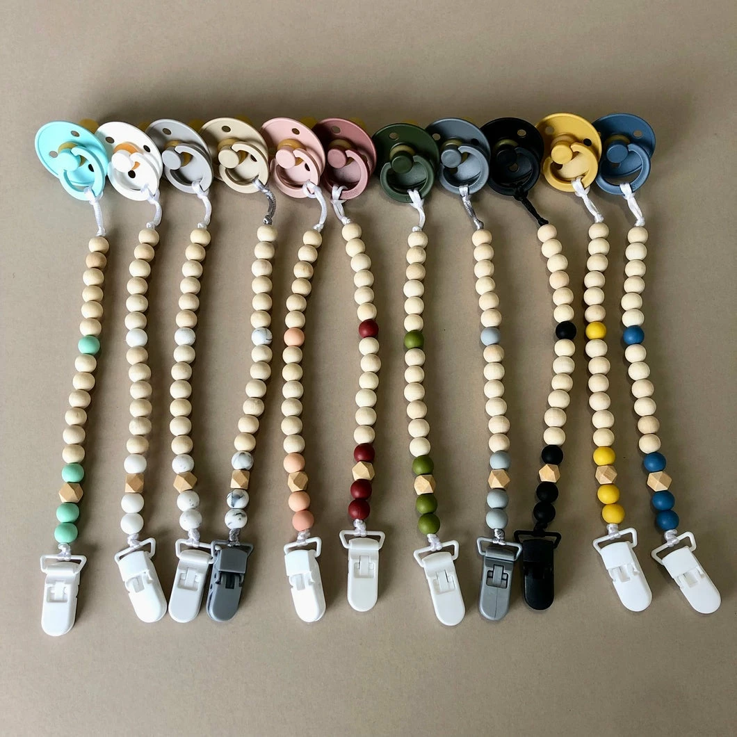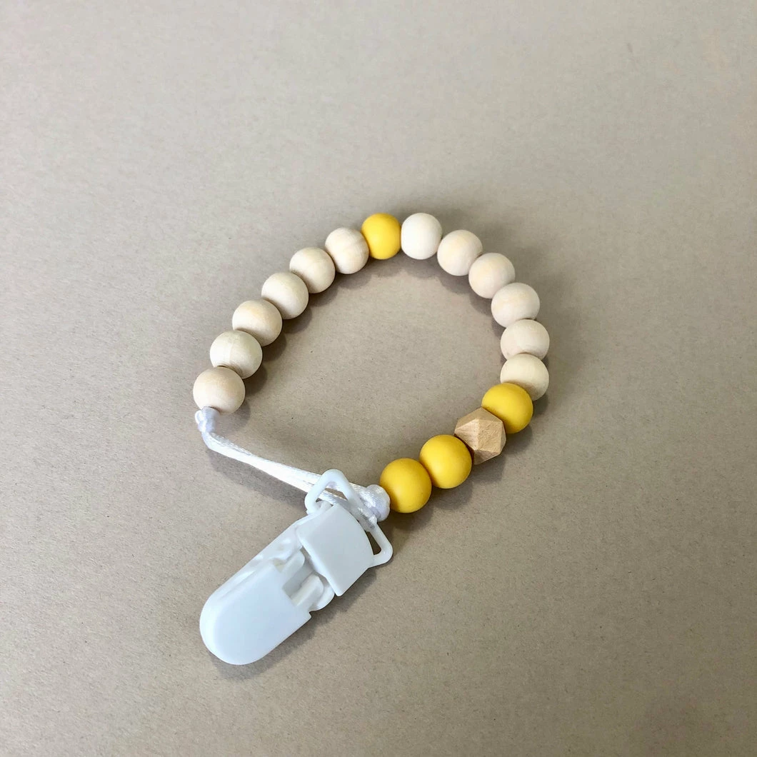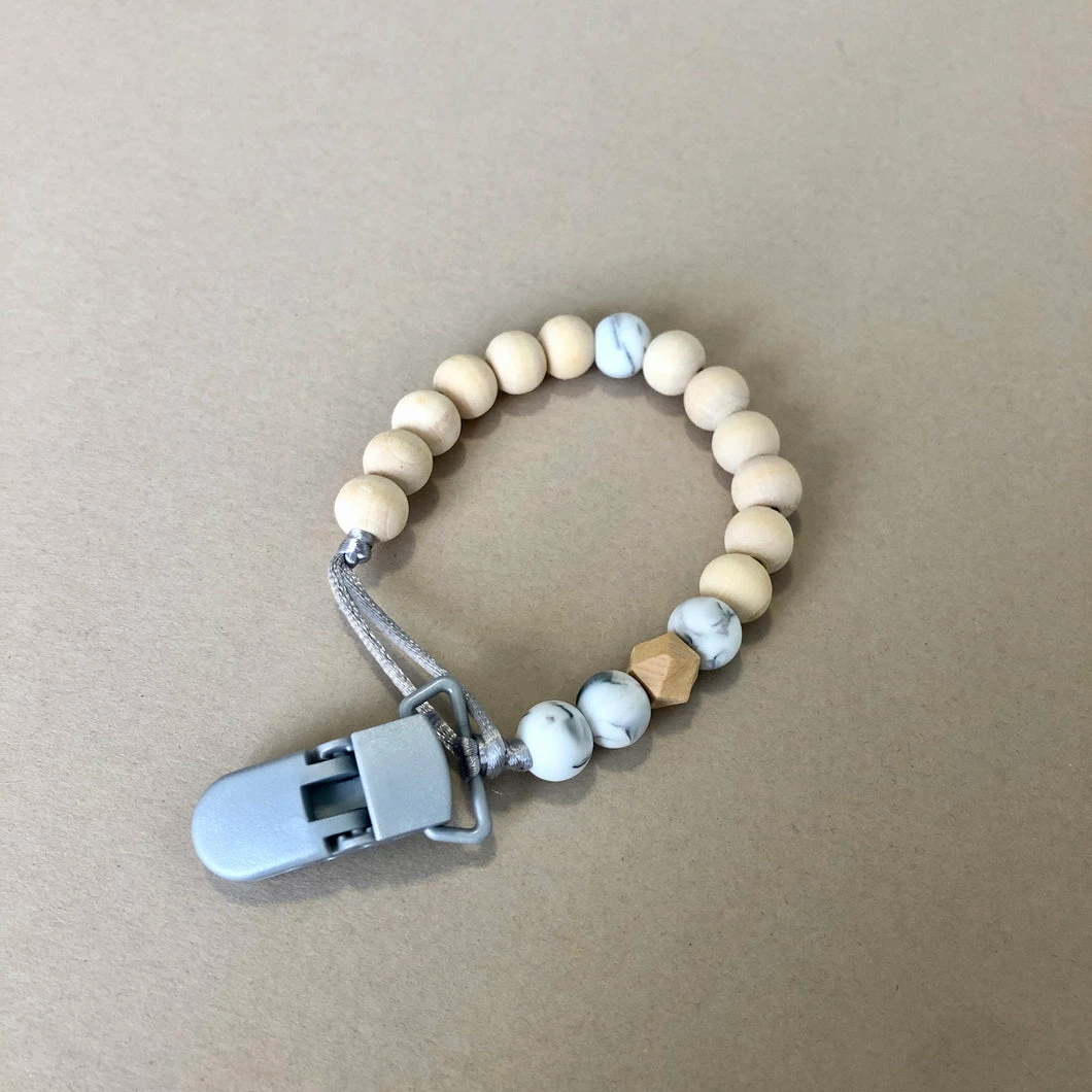 Mix of 12mm Silicone and Wood beads strung on 2mm nylon cord and finished with a dummy clip.