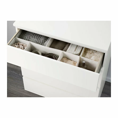 This set of three drawers features smooth running drawers with pull-out stop. It is recommended that this furniture be fixed to the wall with the safety fitting provided to help prevent it from tipping over if a child climbs or hangs on it. Goes perfectly with the rest of the MALM range.