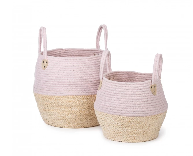 With the Kori basket you can give your kids room or your interieur a modern touch. Use the basket set for decoration or toy basket in your baby room. You can place your magazines or plaids in the baskets. The basket set is available in three colors: white/natural and grey/natural and pink/natural.