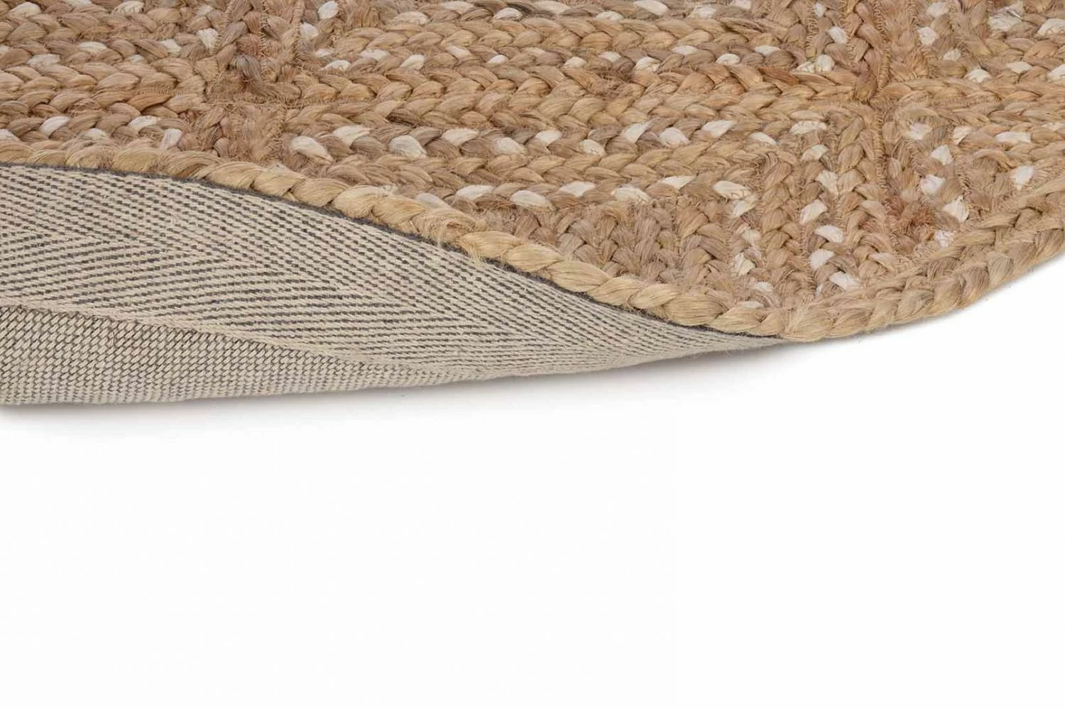Nice round jute rug with backing. The rug has a subtle woven print.