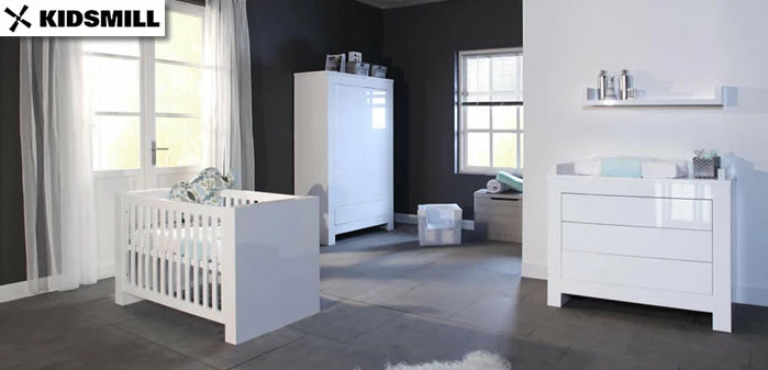 Minimalistic modern design that is both timesess and sleek. You will love the Somero High-Gloss White nursery. This furniture is made of high-quality MDF, finished with a high-gloss white. The design is cool and modern.The handlesless doors and drawers creates a minimalist effect. This furniture fits in a contemporary nursery, as well as in a more rugged interior Somero High-Gloss White is also a perfect fit.
