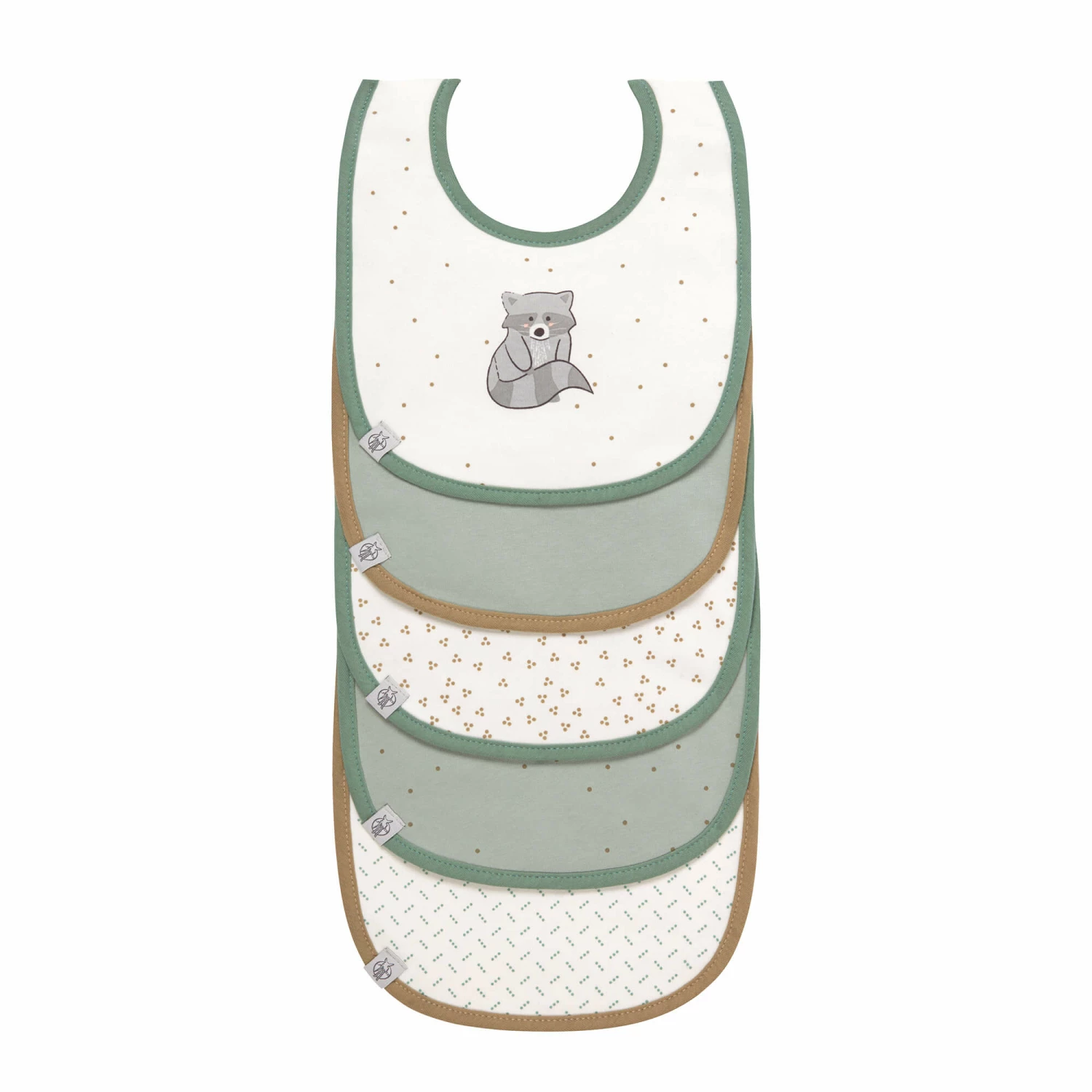 The bibs that are sold in multiple assortments have a Velcro fastener on the reverse side and are made of easy-care cotton and feature a waterproof interior lining to keep baby’s clothing underneath absolutely dry. The set of five is available in various colors, with and without pattern. Suitable for babies and small children from 3 to 18 months.