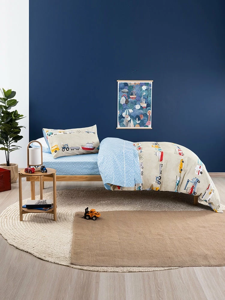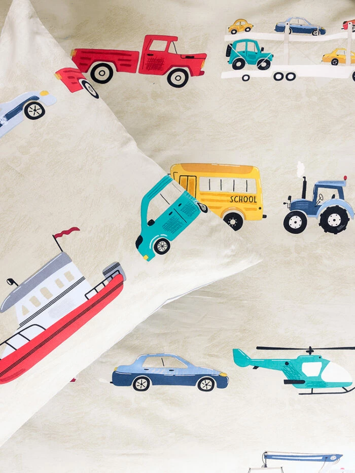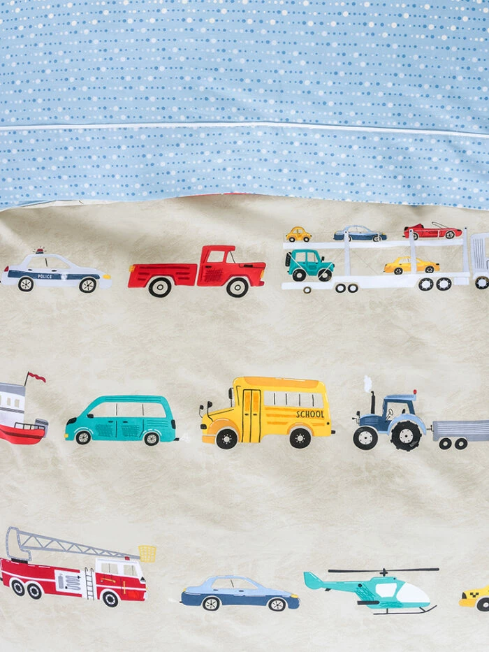 A super fun design for your little one, featuring an array of cars, buses, boats and more! The sophisticated, classic colours mean this duvet will look great in any bedroom. Printed on 100% cotton with a spotty print on the reverse.