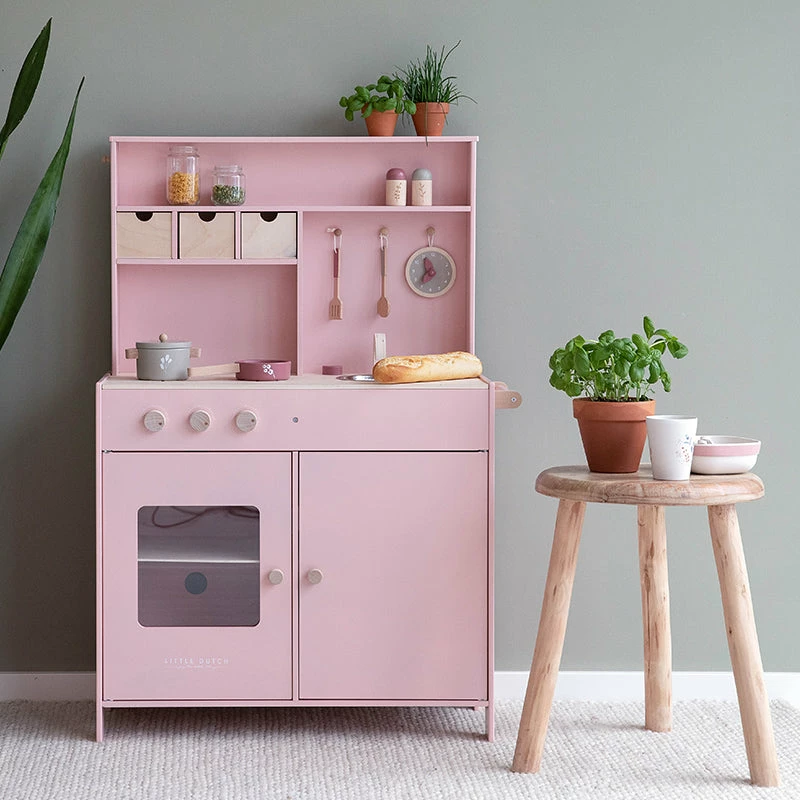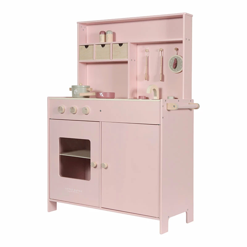 Little chefs make the most delicious dishes in this complete kitchen from Little Dutch. The play kitchen is made of wood and consists of an oven with door, a storage shelf, a sink with tap, a clock and two hot plates. Children can get started right away with the matching kitchen utensils, pans and salt and pepper set. The installation manual is included.