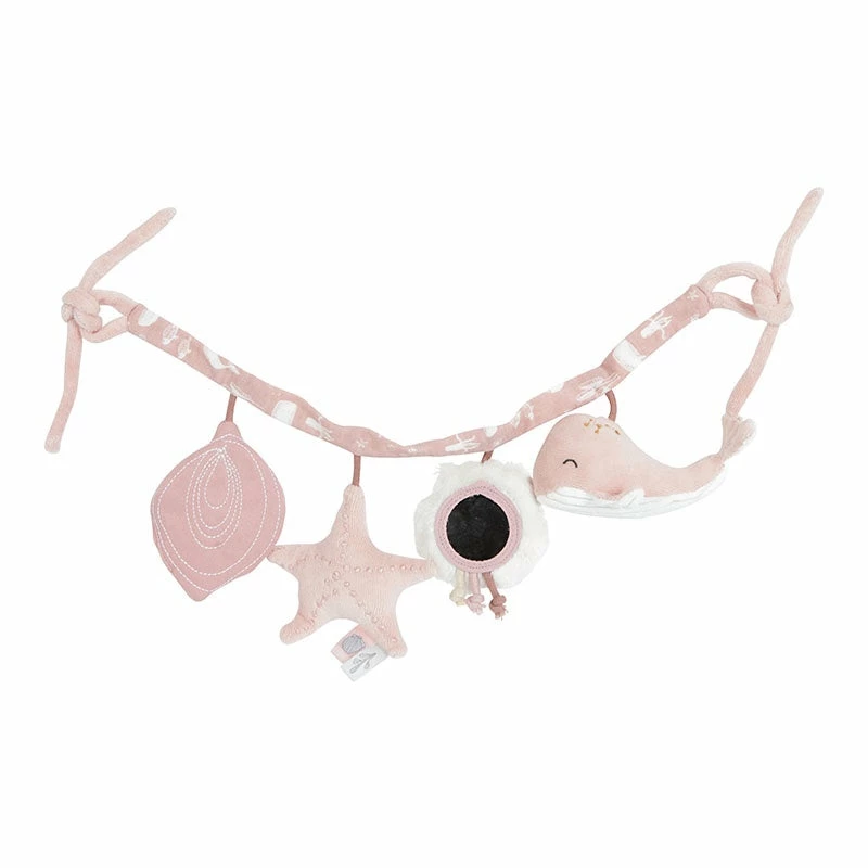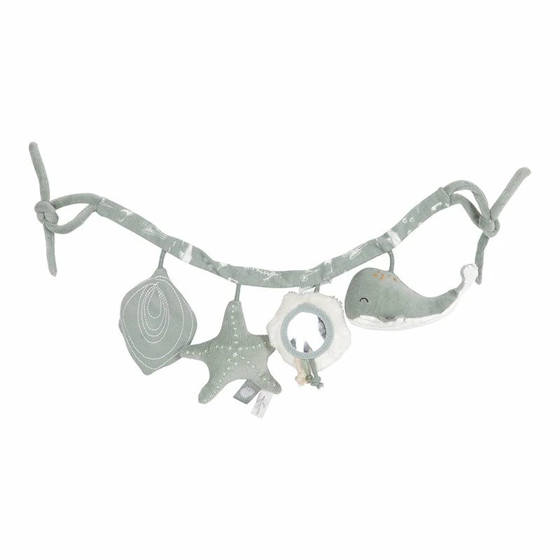 This Little Dutch stroller tensioner from the Ocean collection is easy to attach to a car seat or pram and provides lots of fun and entertainment along the way thanks to the toys with a rattle, mirror, pinch horn and crackle. Also stimulates hand-eye coordination.