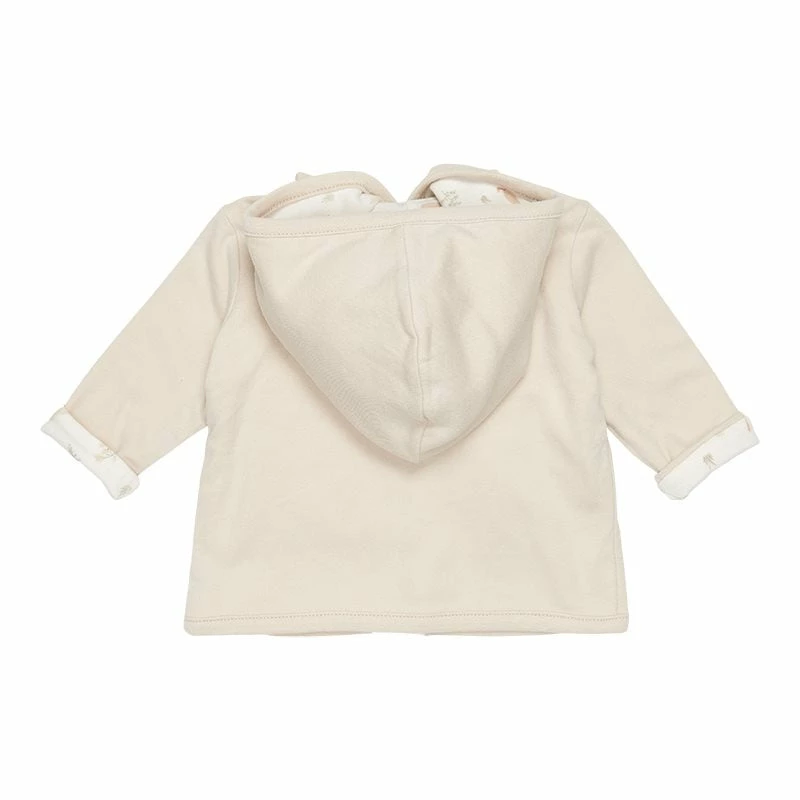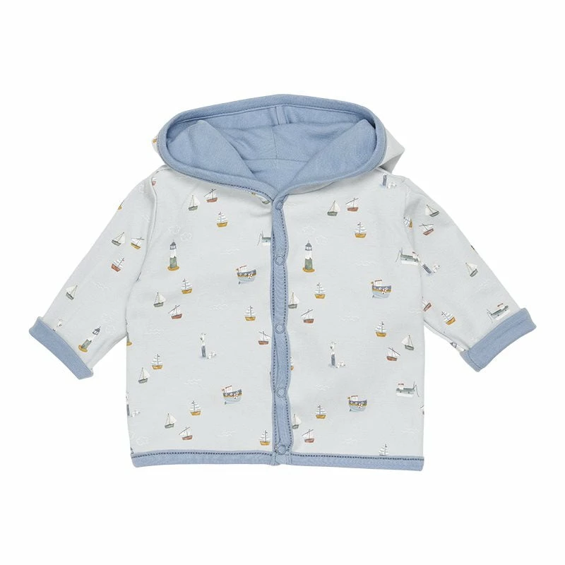 Keep your baby warm in this reversible jacket made from certified organic cotton. This comfy style can be worn in two ways. One side is rendered in a color hue, while the other side features our signature print. The jacket has a hood and a front opening that easily fastens with five buttons. Complete with a cap on colder days.