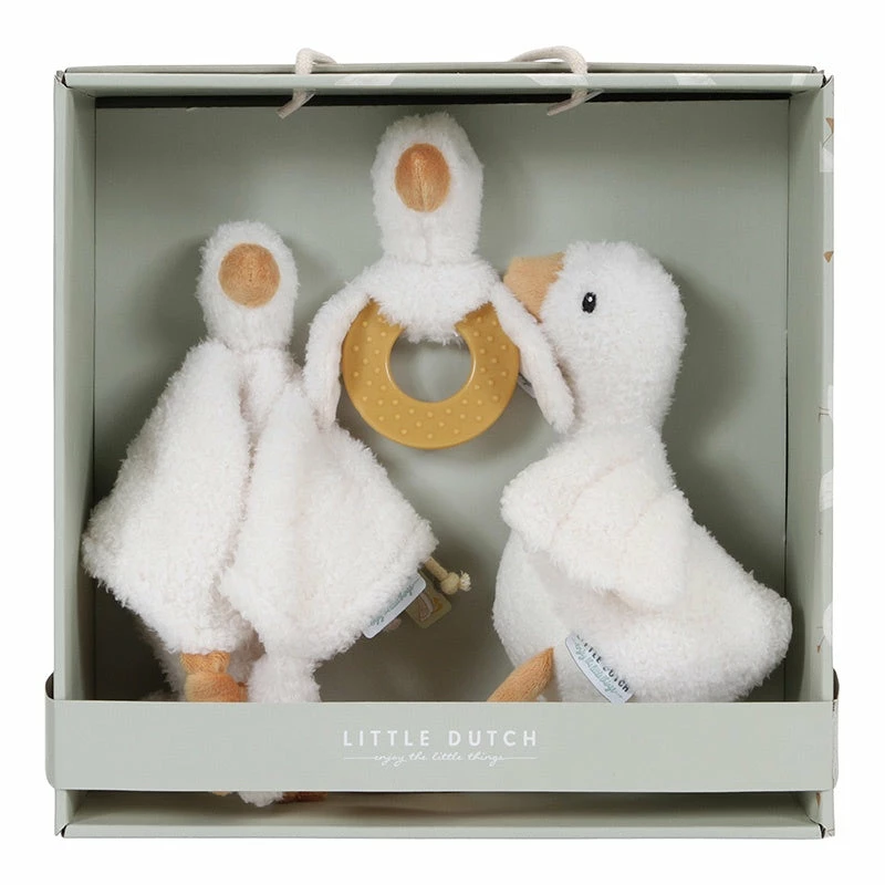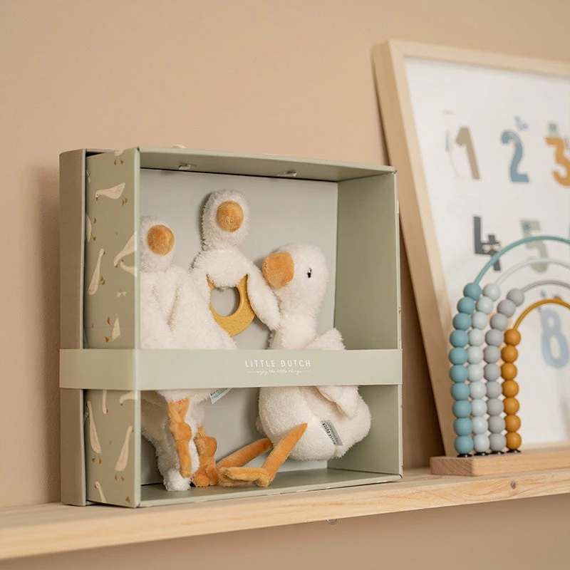 The plush Little Goose is always in for a big hug and likes to go everywhere. This set also includes a rattling teething toy to play with.