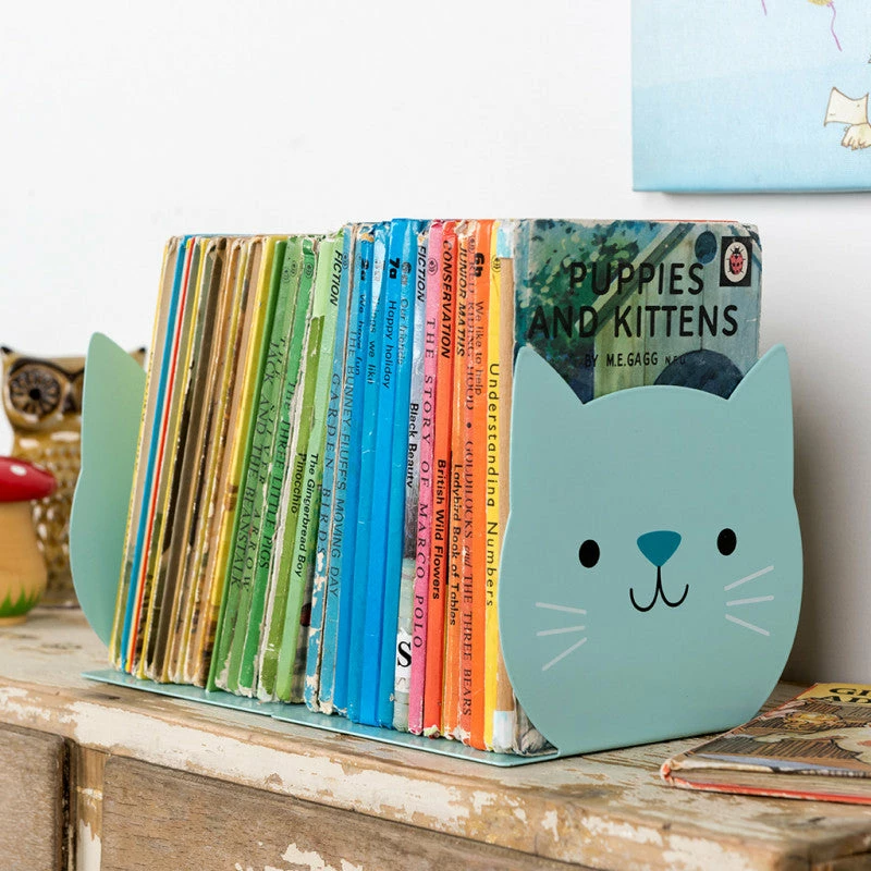 A quirky set of two bookends. Each bookend has four foam pads on the bottom to protect surfaces.