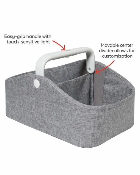 Shed some light on middle-of-the-night diaper changes with our modern diaper caddy! The handle shines softly with a touch sensitive light and a 10 minute auto-off feature. Organize diapers, wipes and more with a modular divider and four pockets.