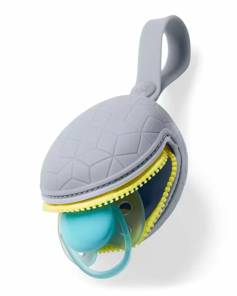 Our silicone pacifier holder keeps pacifiers clean and ready to go with a secure zip closure and a modern compact shape. Designed to fit up to two pacifiers, the soft silicone material is dishwasher safe so it’s easy to clean. A handy strap attaches to your stroller or diaper bag so the baby’s pacifier is always within easy reach.