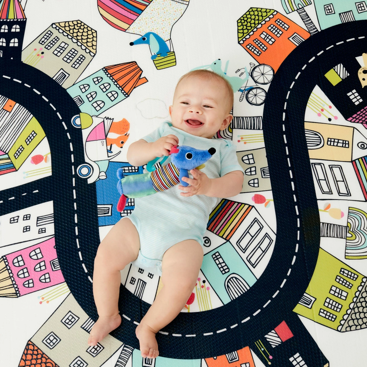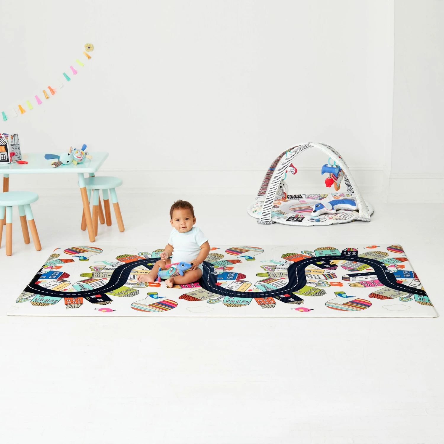 Designed to double the choices for stylish, baby-safe floor covering, our reversible playmat flips from a colorful kid-friendly pattern to a modern décor print for two looks in one. Completely PVC-free, the easy-care foam mat provides a jumbo-size cushioned play space that works equally well in the livingroom or playroom. Simply roll it up for convenient transport and storage.