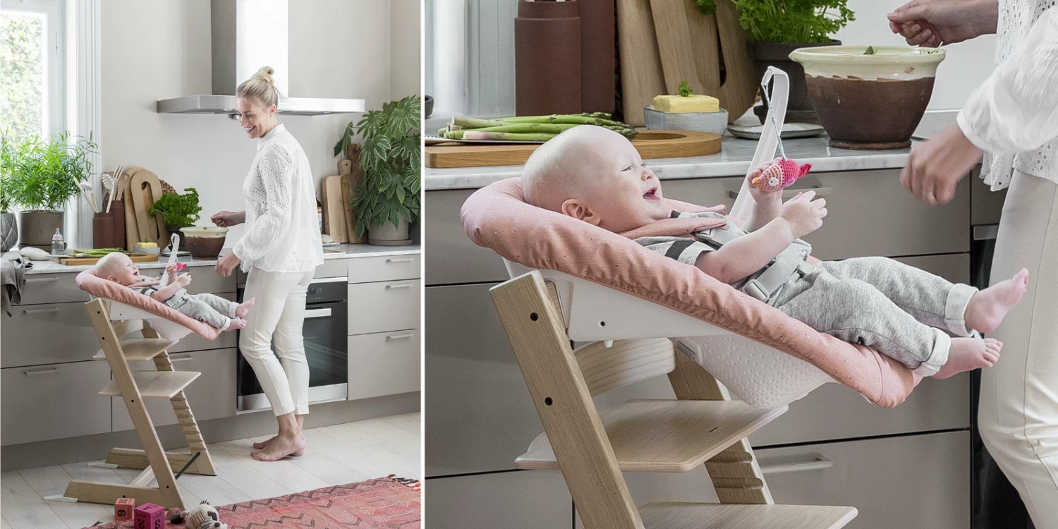 Enables the chair to be used from birth 5-point safety harnessErgonomic and spacious with optimal leg supportComfortably cradles your baby while allowing freedom of movement2 positions for baby´s comfort with one-hand trigger for angle adjustmentSuitable from newborn up to 9kgRed-green indicators turn green when it is mounted correctly on the Tripp Trapp® chairPerforated for optimal air flowEasy to use, no tools required to attach and remove it from the chairThe comfortable upholstery can be removed and machine washedFits any Tripp Trapp® chair produced after May 2003