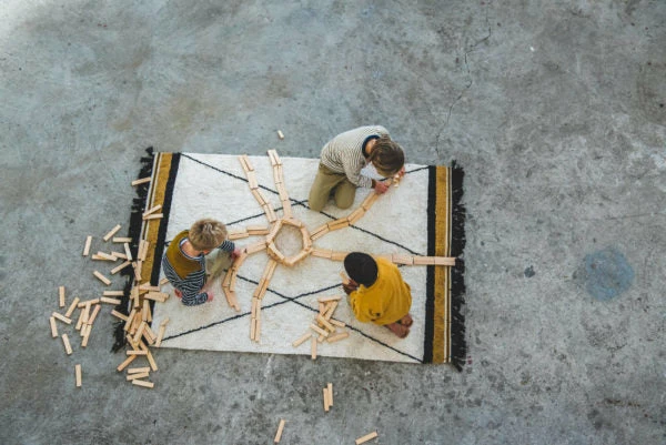 This lovely soft carpet is inspired by a classic Moroccan Berber. You can go in all directions because of the quiet design and the black with ocher yellow color accents. This rug is also very suitable for snuggling up, lying down and playing. The geometric check pattern, the contrasting trim and the fringes at the ends give this soft carpet character. It is beautiful in the nursery or children’s room and immediately gives the room warmth and atmosphere. A very cool children’s rug!