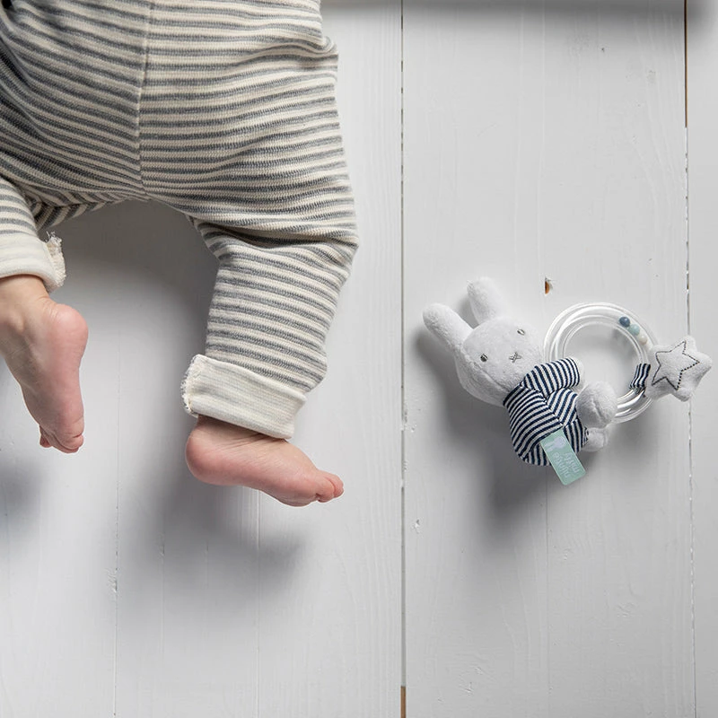 Rattle with transparent ring, when your child moves the rattle, you hear a sound. Good for stimulating the hand / eye coordination of your child.