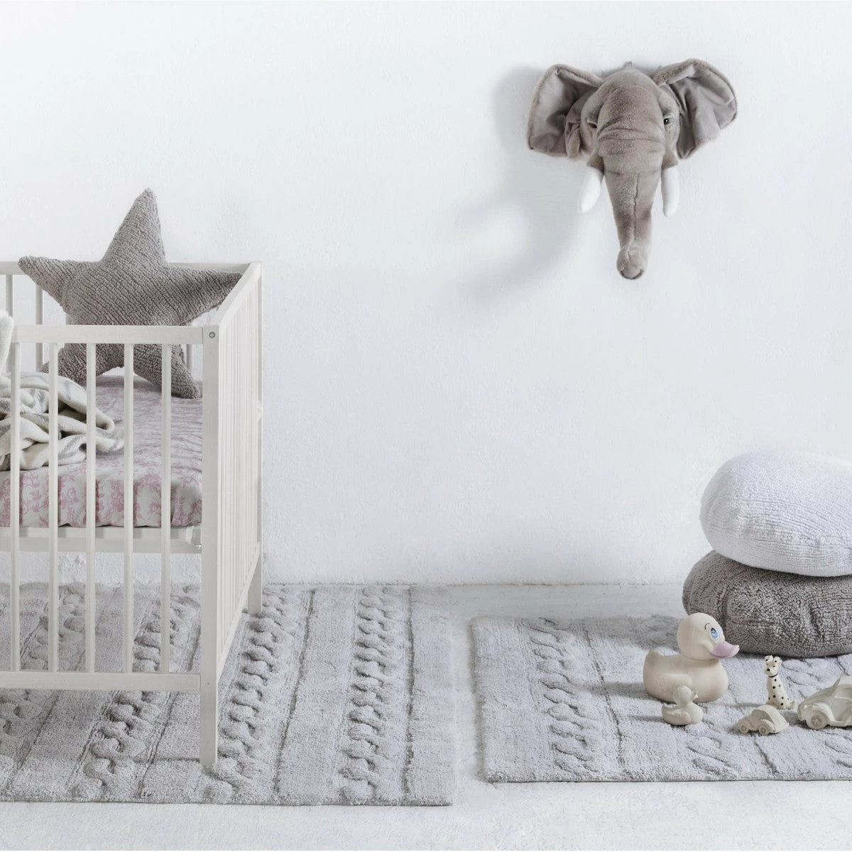 This friendly elephant with it’s pair of tusks, great ears and a long curling trunk will add great decorative impact to a child’s room. It has a soft, plush coat and a comforting expression. The head is light, and easy to hang with the loop attached to the back.